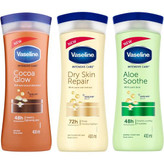 لوسیون بدن وازلین برای پوست های خشک بسیار مناسب بوده و به سرعت و به مدت طولانی پوست را نرم و مرطوب نگه می دارد. این لوسیون بدن ازبرند وازلین حاوی شی باتر ، آلوئه ورا ، کاکائو و همچنین ویتامین می باشد. این ترکیبات قادر است پوست را عمیقا مرطوب و درخشان کند.